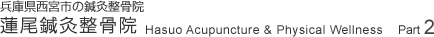 蓮尾鍼灸整骨院 Hasuo Acupuncture & Physical Wellness 〒 662-0971 西宮市和上町 2-35 テルヴェ 2F tel & fax. 0798- 36- 2227 阪神西宮駅 北側バスロータリーを西へ 100m
